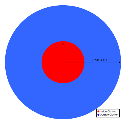 | Figure 1: Diagram of study region. Figure 1 is a diagram of the simulated study region. The circular cluster of increased or decreased risk is displayed in red. Observations falling in the blue area are considered “unexposed” and have a 20% probability of disease. |
