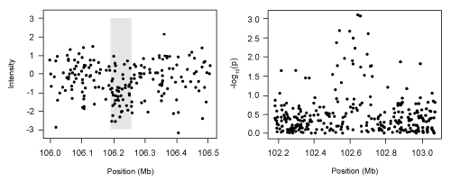 | Figure 1: Left: Illustration of CNV calling. Vertical axis is total intensity, normalized so that 0 corresponds to two copies. The gray shading indicates a region identified as a CNV. Right: Illustration of marker-level testing. The p-values from marker-level tests are plotted on the negative log scale. |