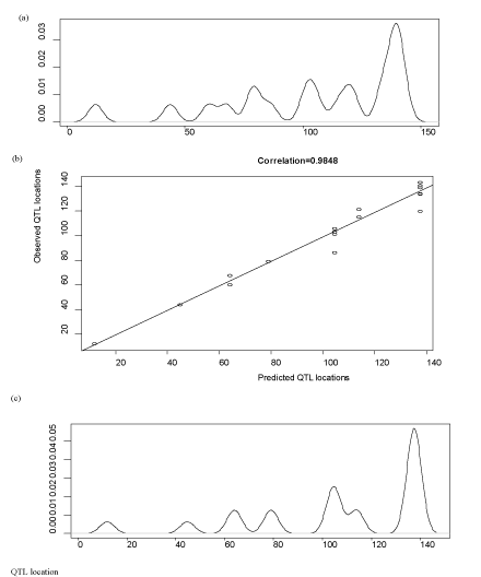 | Figure 6: Average daily body weight gain (ADG) QTL locations on swine chromosome 1: (a) Kernel density plot (bandwidth=5) of ADG QTL locations obtained from 21 primary studies; (b) Correlation between reported ADG QTL locations from 21 primary studies and the estimated QTL locations obtained using the non-parametric meta-analysis model with a Dirichlet process prior (DPP); (c) Posterior distribution of clusters of QTL locations inferred using the DPP model. |