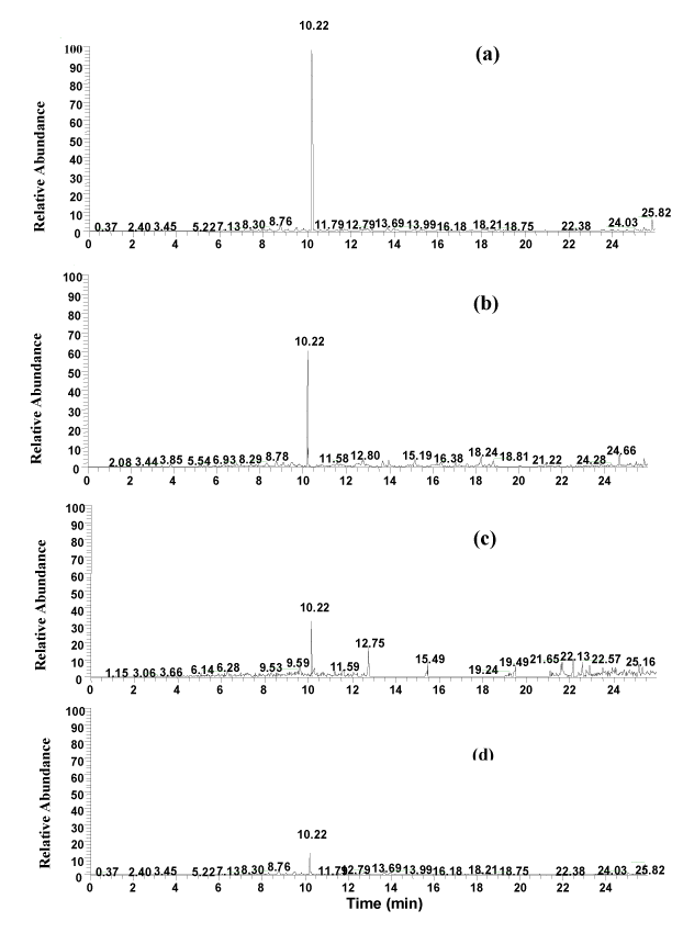 | Figure 3: HPLC analysis of Reactive lanasol Black and its degradation metabolites resulting under anaerobic–aerobic conditions: (a) Untreated dye, (b) at the beginning of the anaerobic incubation (after 2 h); (c) after anaerobic incubation for 10 h; and (d) after anaerobic (10 h)-subsequently aerobic incubation for 4 h. |