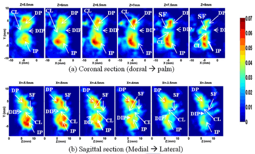 Figure 7 :(a) Selected coronal and (b) sagittal planes of the recovered 3D absorption coefficient image for a typical normal joint. DP: distal phalanx; IP: intermediate phalanx; DIP: distal interphalangeal joint; CL: cartilage; SF: synovial fluid. Reproduced with permission (Figure 3 of Reference 79).