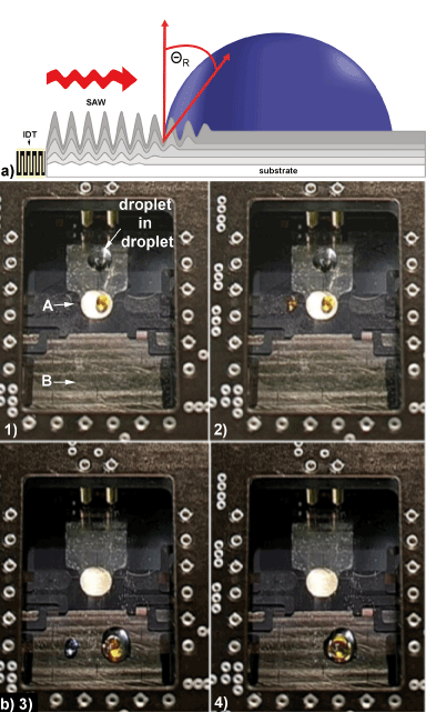 | Figure 1: a) A schematic illustration of the interaction between a surface acoustic wave (SAW) and a fluidat the surface of the LiNbO3 substrate. The SAW is propagating from left to right, impinging the liquid at x=0. A longitudinal sound wave is radiated into the fluid under a refraction angle ΘR. b) The SAW driven microfluidic lab-on-a-chip. Four droplets (≈100 nl each) and a 5μl cover droplet of mineral oil are moved in a “remotely controlled” manner and independently by the nanopumps; 1) through 4) represent a series of snapshots of the lab-on-a-chip system to visualize the movement and the “nanochemical” reactions occurring when the droplets are merged and mixed in the reaction centers A and B by the action of the surface wave. |