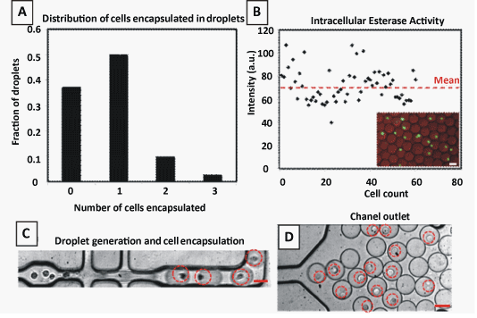 | Figure 2: (A) Representation of deterministic encapsulation of single cells into pico-droplets; (B) Plot representing the distribution of intracellular esterase activity seen in cells; the scale bar refers to 50 μm; (C,D) Images of the droplet forming region and the channel outlet showing single cells encapsulated into individual droplets. |