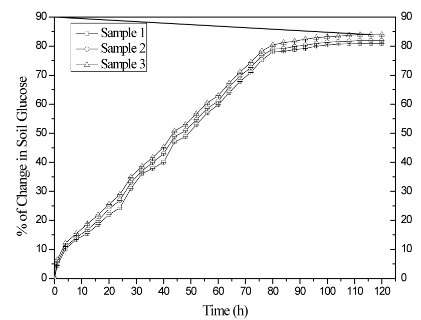 | Figure 4: The percentage change of glucose content in soil against incubation time at 20°C. The glucose contents in soils are determined by L-O-HTCC/GOx immobilized eggshell membrane biosensor. Samples 1, 2 and 3 are soils which contained the lowest, medium and highest glucose content, respectively. |