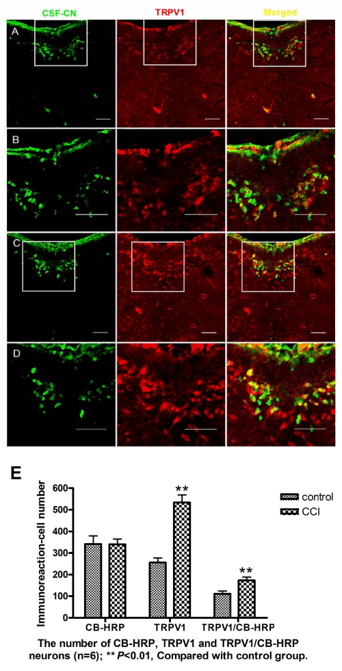 | Figure 4: TRPV1-expression in SD rats under neuropathic pain. Photomicrograph (C) shows TRPV1-expression in CCI rats at 10 days following surgery, which is significantly higher than the control rats (A). B、D are showed the enlargement of the rectangle in A、C. Graph (E) depicts the numbers of neurons labeled with TRPV1 or CB-HRP in every six sections of two group. Scale bars represent 100μm. |