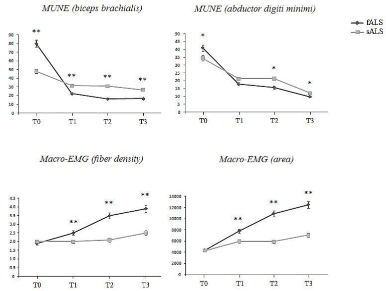 | Figure 1: The top row shows MUNE values both for biceps brachialis, on the left, and abductor digiti minimi muscles, on the right, at different time points (at the moment of diagnosis and after 4, 8 and 12 months, respectively T0, T1, T2 and T3). Note that, at the moment of diagnosis, motor units number is higher for familiar cases (black lines, fALS) compared with sporadic ones (gray lines, sALS). Bottom row shows Time trend of Macro-EMG parameters (area, fiber density) over time. All the values increase more steeply in familiar than in sporadic forms (black and gray lines, respectively), strengthening the idea that in the first group there is a paradoxical more effective axonal sprouting (modified from Bocci et al. [7]; *p < 0.05; **p < 0.01). |