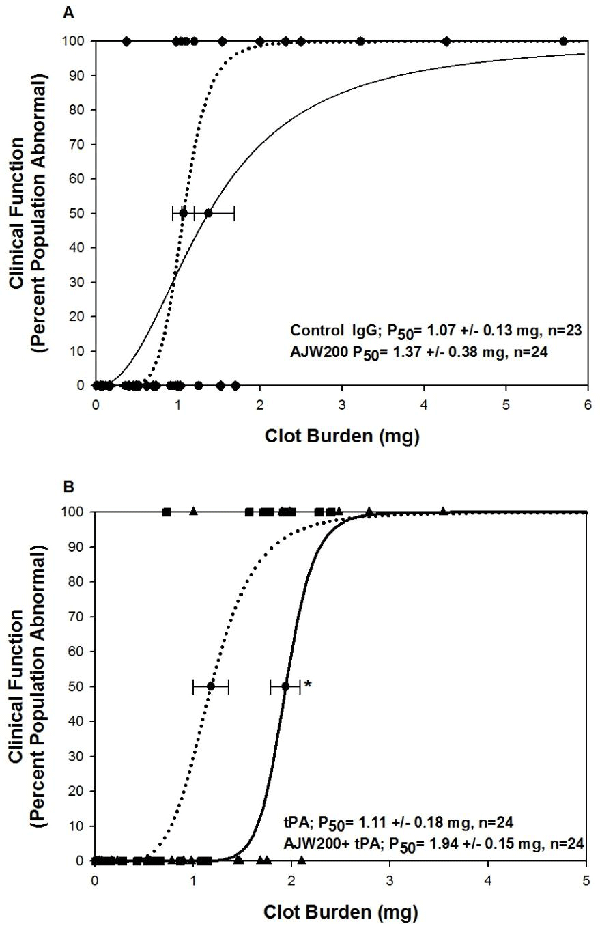 | Figure 1: Quantal curves: anti-vwf-ab/tpa combination analysis. A: Effect of AJW200 alone or in combination with low-dose tPA on clinical function. Control IgG (0.3mg/kg); Black Circles- Black Dotted LINE; AJW200 Ab (0.3 mg/kg) Black DIAMONDS- Black Solid LINE. B: Effect of AJW200 in combination with low-dose tPA on clinical function compared to low dose tPA. tPA (0.9mg/kg)- Black Squares- Black Dotted LINE; AJW200 (0.3mg/kg) + tPA (0.90 mg/kg IV- Black Triangles UP- Black Solid LINE. |