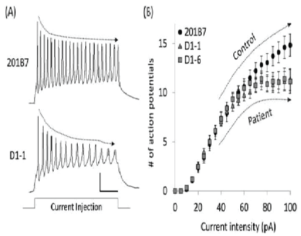 | Figure 3: Representative traces of action potential trains and input-output relationships: (adapted from Reference [12] with modifications). (A) The 500- ms current injection period is indicated below. The traces presented are those evoked by a 100-pA current injection. Toward the end of the current injection, D1-1 neurons showed more prominent attenuation of action potential amplitude compared to 201B7 neurons, as indicated by the dotted arrows. The frequency of action potentials was also lower in D1-1. Scale bars indicate 20 mV and 100 ms. (B) Mean of the total number of action potentials evoked during the 500-ms stimulation period vs. injection current intensity (input–out put relationship). In all cell lines, the number of action potentials increased with intensifying currents. However, when current intensities exceeded 60 pA, the rate of action potential increase plateaued in both patient lines, which was not the case in control cells. |