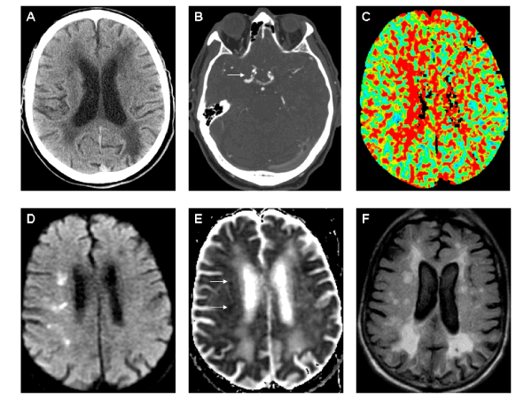 | Figure 1: A. Non-contrast computed tomography (CT) scan showed bilateral periventricular and subcortical hypodensities suggestive of remote small vessel ischemia. An ill-defined right frontal subcortical hypodensity and an old left posterior parietal infarct were also appreciated. B. CT angiography identified bilateral right greater than left supraclinoid calcified plaque with moderate to severe right-sided stenosis (white arrow). C. CT perfusion scan showed prolonged mean transit time and mild increased cerebral blood volume (not shown) in the right subcortical middle cerebral artery territory. D-E. Diffusion weighted imaging and apparent diffusion coefficient scans showed restricted diffusion (arrows) in right subcortical fronto-parietal regions. F. Axial fluid attenuated inversion recovery (FLAIR) imaging revealed bihemispheric periventricular and subcortical increased signal, diffuse sulcal widening with mild global atrophy, associated encephalomalacia in left posterior parietal region, and right subcortical increased signal corresponding to some of the restricted diffusion sites. Note: all images displayed using radiographic convention. |