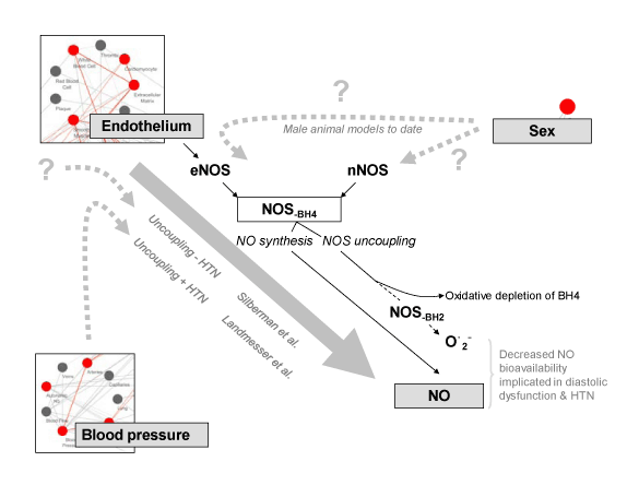 | Figure 3: Relationship between endothelial cells and nitric oxide (NO) synthesis, as implicated in HFpEF pathophysiology. Pathways shown represent experimental evidence to date; avenues for future experimental investigation are highlighted by ‘?’. Abbreviations: NO, nitric oxide; eNOS, NOS, nitric oxide synthase, eNOS, endothelial derived nitric oxide synthase; nNOS, neuronal nitric oxide synthase; BH4, tetrahydrobiopterin (NOS cofactor); O˙2ˉ, superoxide; HTN, hypertension. Landmesser et al. [63], Silberman et al. [64]. |