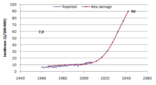 | Figure 4b: Calculated development of age-adjusted brain tumor rates in Norway assuming the use of cell phones at the level used in 2006 creates 25-fold brain damages as earlier by natural causes. A 25-fold increase in the brain cancer incidence is not expected until 2080 due to latency effects. |