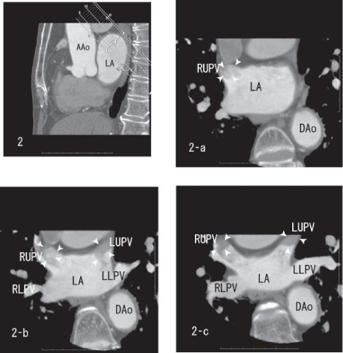 | Figure 2: Sagittal images showing thrombi within the right upper and the left upper pulmonary veins (white arrow head). The merge of thrombi was vague (2-a and 2-b). The right upper and the left upper pulmonary veins demonstrated the sharp merge of enhancement (2-c). AAo: Ascending Aorta; DAo: Descending Aorta; LA: Left Atrium; LUPV: Left Upper Pulmonary Vein; LLPV: Left Lower Pulmonary Vein; RUPV: Right Upper Pulmonary Vein; RLPV: Right Lower Pulmonary Vein. |
