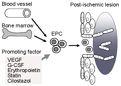 | Figure 2: Potential role of endothelial progenitor cells in vascular repair process. Endothelial progenitor cells (EPCs), which derived from bone marrow or blood vessels, have been shown to augment ischemia-induced angiogenesis, either by paracrine effects of cytokines such as VEGF, IGF-1, or direct incorporation into the endothelial layer, following differentiation into mature endothelial cells. Many researchers suggested that some factors such as VEGF, G-CSF, Erythropoietin, Statin, or Cilostazol can promote EPCs mobilization, or enhance the recruitment of EPCs to sites of an injury area. |