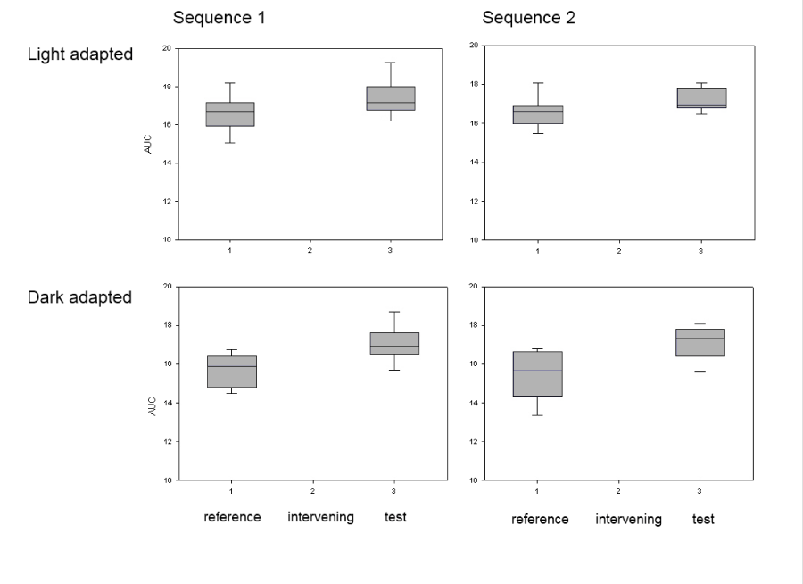 | Figure 3: Box plot showing AUC. AUC during exposure to blue light in the light adapted state (upper panel) and after 30 minutes of dark adaptation initial to the reference stimulus (lower panel) for the two test sequences. Data are given as area under the curve (AUC) for the first reference blue stimulation and the third test stimulus, intervening stimulation of either blue or red are not shown. Both for sequence 1 (intervening blue) and sequence 2 (intervening red) the AUC for the final test stimulus was significantly increased compared to the initial stimulation, in particular for the dark adapted state. The AUC of the first reference blue stimulus following light adaptation was larger than the AUC for first reference blue stimulus following dark adaptation for both sequences 1 ( P = 0.08) and 2 ( P = 0.05). |