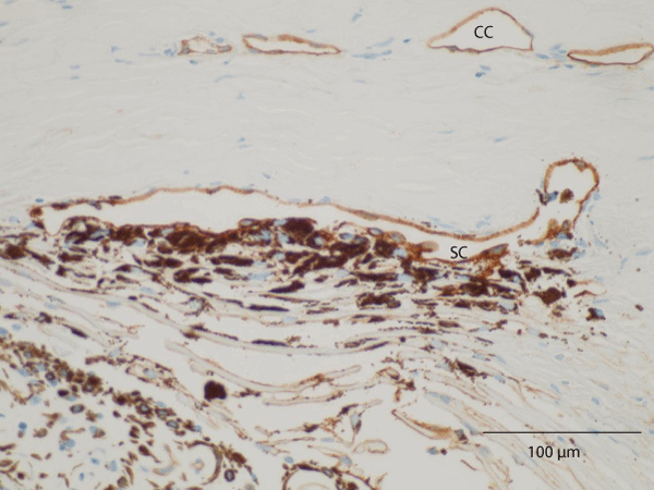 | Figure 4: Light microscopic photograph of a specimen subjected to thrombomodulin immunohistochemical staining, which can be used to detect Schlemm’s canal (SC). Trabecular cells in the uveal and corneoscleral meshwork were heavily pigmented. The most conspicuous finding was the existence of strongly pigmented trabecular cells in the cribriform meshwork. Note the absence of trabecular lamellae fusion and the normal size of the SC, which was positively stained with thrombomodulin |