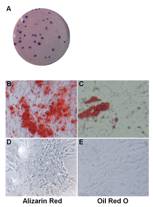 | Figure 2: Characterization of hASCs. A) hASCs were seeded at low density and incubated in CCM for 14 days to allow CFUs formation. The colonies were fixed and stained with crystal violet. B-C) representative images showing osteogenic (Alizarin Red staining) and adipogenic (Oil Red O staining) differentiation of hASCs, respectively. D-E) representative images showing hASCs cultured in CCM for 3 weeks as controls and stained with Alizarin Red and Oil Red, respectively. Original magnification 4x for B and D and 20x for C and E. |