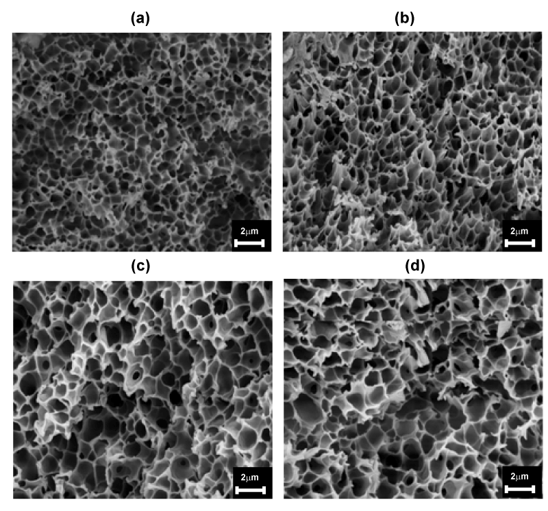 | Figure 4: The effect of the solvent concentration in the coagulation bath on membrane structure (with magnification 10000). Coagulation bath: (a) pure deionized water; (b) 40 vol.% DMAc, (c) 80 vol. % DMAc and (d) 90 vol. % DMAc-10 vol. wt% deionized water. |