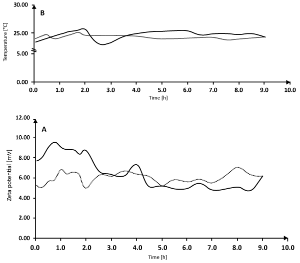 | Figure 1: Zeta potential and temperature changes of PES+ membrane over a time period of 10 h (means, n=3). A: ____ Zeta potential of PES+ apical side, Zeta potential of PES+ basolateral side B: ____temperature of PES+ apical side, temperature of PES+ basolateral side. |