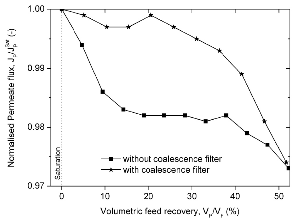 | Figure 6: Decrease of the normalized permeate flux with increased recovery rate during the recovery of Pyr16 (CF3SO2)2N by cross-flow filtration (25°C, 35 bar, 0.5 m/s) and using the NF-270 membrane. The effect of using a coalescence filter on permeate flux is shown. |