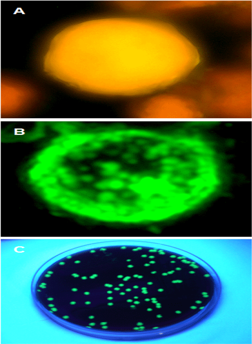 | Figure 1: Viability and cultivability of the intracellular V. cholerae O1 tagged green fluorescent protein (GFP). A. Alone cultivated Acanthamoeba castellanii cyst emitting autoflourescene. B. Intracellular V. cholerae emitting green fluorescence. C. The intracellular V. cholerae grew on blood agar plate in presence of ampicillin. The colonies emitted green fluorescent when exposed to UV light. |