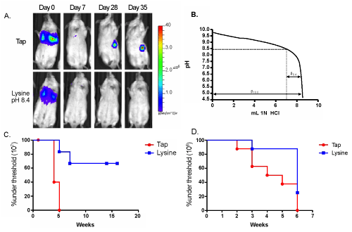 | Figure 3: Lysine free base reduces metastases through pH buffering. SCID mice were divided in two groups: the “control” group and a “lysine” group, which received supplementation of lysine free base in drinking water at pH 8.4. Both groups were injected with the bioluminescent PC-3M prostate cancer cell line (A). In order to determine if the metastatic inhibition was due to the pH buffering properties of lysine, or due to its metabolism, we titrated lysine down to a pH of 8.4, using HCl (1N), a pH at which the pH buffering capacity is significantly reduced (β10.0=8.5 mEq vs. β8.4=1.5 mEq). (B) Tumor burden was quantified through in vivo bioluminescence along 6 weeks, and the effect of “de-buffered” lysine in survival was compared with the previously published results of lysine at pH 10 [15]. The lethal burden threshold for the survival curves was set at 3-fold the background signal (Rose criterion), which was considered as being the bioluminescent signal one week post injection. According to the Log-rank (Mantel-Cox) test, there was a significant increase in overall survival in the group orally supplemented with lysine pH 10 (P=0.0038, median survival control=4 weeks, median survival lysine pH10.0=undefined) (C). In this work, mice in the group supplemented with “de-buffered” lysine (pH8.4) showed a less noticeable difference in survival compared to the control group (P=0.0417, median survival for control group=4.5 weeks, median survival for lysine pH8.4=6), which reinforces the idea that the anti-metastatic properties of lysine are linked to its pH buffering capacities, rather than its metabolic properties (D). |