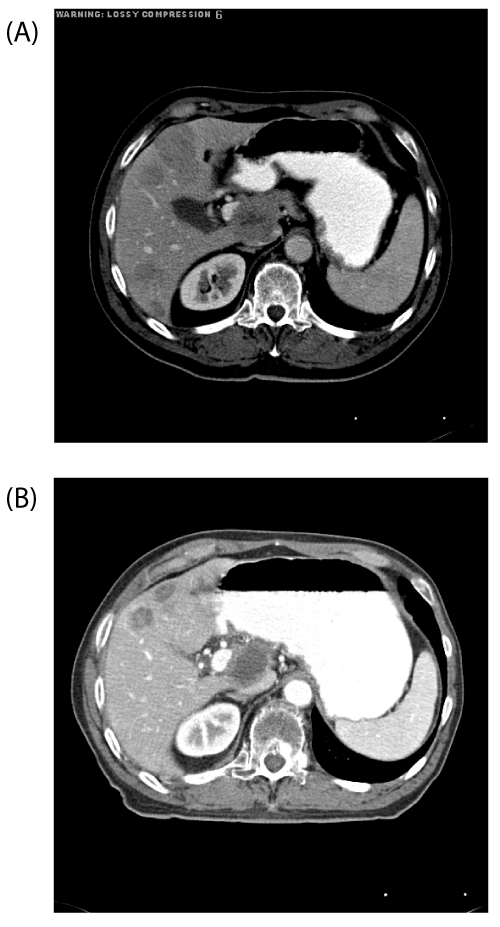 | Figure 3: A. Pretreatment diagnostic CT axial image of the patient in Figure 2. B. Post-treatment diagnostic CT axial image of the same patient at the same portion of the liver at 9 months after 90Y microsphere therapy, scored as a RECIST partial responder although no enhancement or lesion growth was ever seen in follow up. The software-estimated tumor dose was 86.6 Gy and normal liver was only 16.5 Gy; MIRD estimate was 43.7 Gy. The total activity delivered was 2.0 GBq, with tumor volume of 296.8 cc and normal liver 2109.3 cc. This patient did not experience any grade 1-3 toxicities. |