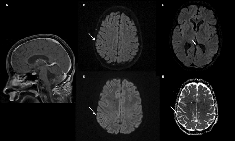 | Figure 2: Images from follow-up MRI study following surgical resection, chemotherapy and after completion of radiation therapy showing changes of surgical resection of posterior fossa mass (A). Axial FLAIR images showing resolution of the right parietal lesion (B-thin white arrow) and decreased conspicuity of the left medial temporal lesion (C-thick white arrow). No evidence of restricted diffusion in the location of the previously seen right parietal lesion on B=1000 diffusion image (D) and ADC map (E) consistent with resolution. |