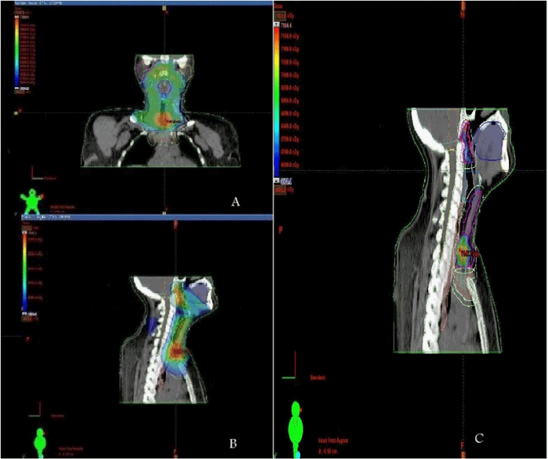 | Figure 1: Intensity modulated radiotherapy technique incorporated with 5-7 beamlets showing isodose distribution in axial, saggital and coronal images of phase 1 (A, B) and boost(C) in saggital and coronal views of MPR (multiplanar reconstructed radiographs). |
