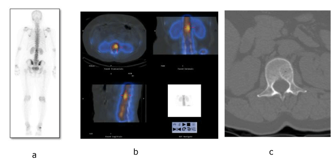 | Figure 1: a) Planar images of bone scan showing increased tracer uptake in L1 vertebra b) SPECT-CT fusion images revealed increased tracer uptake in L1 vertebral body corresponding to a osteolytic lesion in CT images C) CT section in bone window at L1 vertebra showing a well defined lesion with peripheral sclerotic rim and central ‘polka dot sign’. |