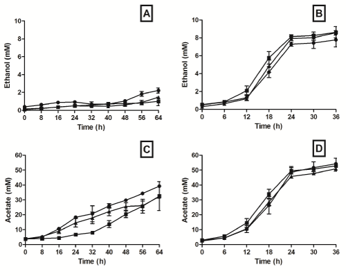 | Figure 3: C. ljungdahlii production of (A) ethanol and (C) acetate in syngas reactors and (B) ethanol and (D) acetate in syngas-fructose reactors inoculated with cells pre-adapted on fructose (circles), syngas-fructose (squares), and syngas (triangles). |