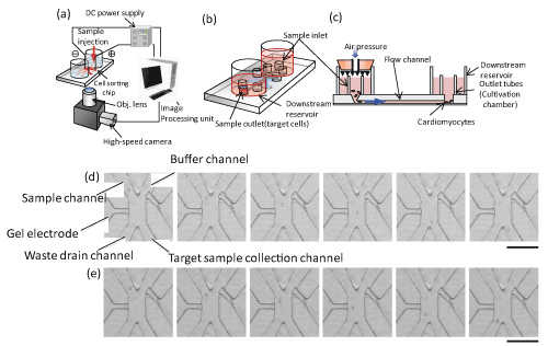 | Figure 1: Selection of cardiomyocytes with on-chip cell sorting system. (a) System design of on-chip cell sorting system. (b) Chip design of on-chip cell sorting system. (c) Cross sectional view of the chip. (d) The time course images of cell sorting area during the collection of selected cells. Each image was obtained 33ms. Bar, 100 μm. (e) The time course images of cell sorting area during the removing the non-selected cells. Each image was obtained 33ms. Bar, 100 μm. |