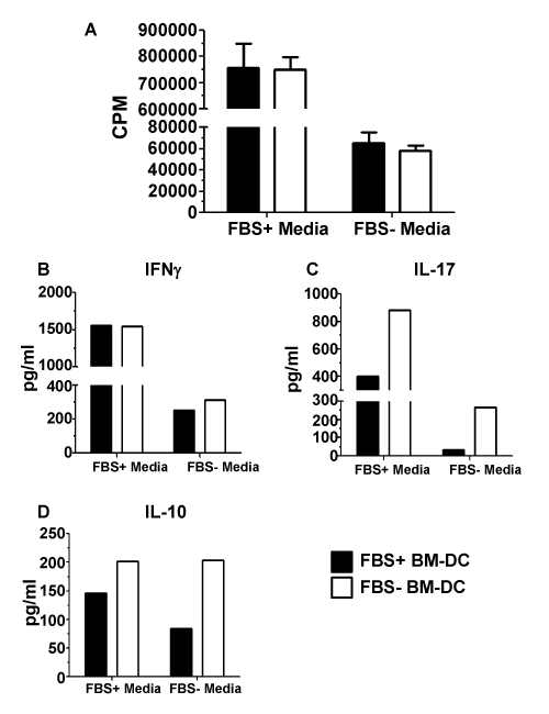 | Figure 3: In vitro antigen specific T cell proliferation and cytokine production. 1x104 FBS+ or FBS- BM-DC pulsed with 1040-55 mimepitope peptide were used to stimulate 1x105 BDC2.5 CD4+ splenocytes in both FBS+ and FBSculture media for 96 hours. A. Tritiated thymidine uptake was measured during the final 18 hours of incubation. B-D. Supernatant was removed after 72 hours of incubation and the indicated cytokines were measured with a multiplex cytokine immunoassay. |