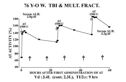 | Figure 1B: In contrast, demonstrates a case that showed remarkable elevations in AT activity after AT agent though with the same dose, but this case received 25% albumin infusion after each AT challenge. Serum levels of albumin were increased, though not remarkably, from 2.8 to 3.2 g/dl on the third day. Vd, distribution volume; T1/2α, half-life on the distribution phase. Cont: Control. MULTI TRAUMA: Multiple Trauma; TBI: Traumatic Brain Injury. |