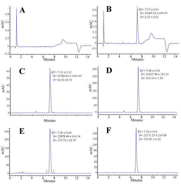 | Figure 3: HPLC chromatograms of (A) Typical blank (solvent) baseline in which the solvent peak appeared within the first two minutes followed by the unstable meanders 8 min as the result of gradient elution and disappeared upon reconditioning of the column; (B to D) were alpha-mangostin reference standards of 0.2 μg/mL, 20 μg/mL and 100 μg/mL, respectively; (E) Own isolated, pure alpha-mangostin 100 μg/ml and (F) Extracted alpha-mangostin from the PLGA microspheres. The results of retention time (RT), number of theoretical plate (N) and peak height (H) were expressed as the mean of three replicates ± standard deviation. |