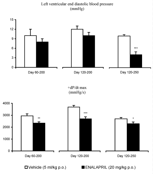 | Figure 1: Effects of enalapril (20 mg/kg/day) on left ventricular end diastolic blood pressure and maximum positive dP/dt in cardiomyopathic Bio TO-2 dilated hamsters. Early treatment was administered from 60 to 200 days of age, late treatment from 120 to 200 days of age and prolonged treatment from 120 to 250 days of age. Mean ± s.e.m. (n = 10 to 12). Significantly different from corresponding control values using ANOVA (* = p < 0.05, ** = p < 0.01, *** = p < 0.001). |
