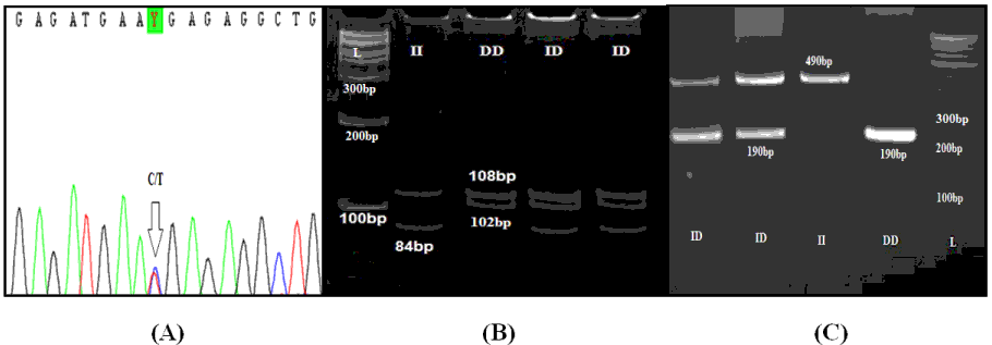 mutation CT at codon 923. (B) PAGE showing homozygous wild (II) with band size 108bp and 84bp, heterozygous (ID) with band size 108bp, 102bp and 84bp and homozygous mutant 108bp and 102bp. (C) ACE genotyping in 2% Agarose Gel with homozygous wild (II) with band size 490bp, Heterozygous (ID) with band size 490bp and 190bp and homozygous mutant 190bp. (I: Insertion; D: Deletion: L: DNA Ladder). |