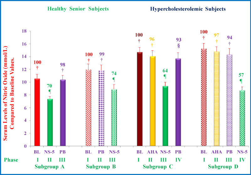 | Figures 2: Serum levels nitric oxide (NO) are decreased with NS-5 consumption. The treatments 1 – 14 columns in the figure correspond to: Group A, n = 16; 1 = BL (Baseline); 2 = NS-5 capsule (Nutrition Supplement-5); 3 = PB capsule (Placebo-starch); Group B, n = 16; 4 = BL; 5 = PB capsule; 6 = NS-5 capsule; Group C, n = 32; 7 = BL; 8 = AHA ( American Heart Association Step-1 diet); 9 = AHA + NS-5 capsule; 10 = AHA + PB capsule; Group D, n = 32; 11 = BL; 12 = AHA; 13 = AHA + PB capsule; 14 = AHA + NS-5 capsule. The baseline serum NO levels of free-living healthy seniors of subgroups A and B were established during phase I. Subjects were then randomized to receive NS-5 capsule (subgroup A) or placebo capsule (subgroup B) for 6 weeks (Phase II). After a 2 week washout (no treatment), the subgroups were crossed over so that subgroups A and B received placebo capsule and NS-5 capsule, respectively, for 6 weeks (phase III). Similarly, the baseline serum NO levels of hypercholesterolemic subjects of subgroups C and D were established during phase I. All the subjects of (C,D) were then placed on an AHA Step-1 diet for 4-weeks, and NO levels measured again after 4 weeks (Phase II). They were then randomized to receive NS-5 capsule (subgroup C) or placebo capsule (subgroup D) for 6 weeks (Phase III). After a 2 week washout, the subgroups were crossed over so that subgroups C and D received placebo capsule and NS-5 capsule, respectively, for 6 weeks (Phase IV). The subjects of subgroup C and D were remained on the AHA Step-1 diet during phases III and IV and during the washout. The experimental details for Figures 3 to 9 were exactly same as described above. Data are means ± SE. Values in a column not sharing a common symbol are significantly different of various groups at A-¶ P < 0.02, B-¶ P < 0.02, C-¶ P < 0.02, D-¶ P < 0.01. Percentages of each treatment compared to baseline values are above the column. |