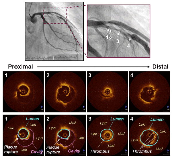 | Figure 1: Representative OCT images of plaque rupture in unstable angina pectoris. Angiography showed a complex lesion in the left anterior descending coronary artery. OCT revealed a plaque rupture with a residual fibrous-cap and plaque cavity (#1 and #2), and intracoronary thrombi (#3 and #4). Schemas demonstrate plaque rupture, lumen, ruptured cavity, lipid, and thrombi. Plaque rupture was observed at the minimal lumen area site [minimal lumen area = 1.83 mm2 (#1); maximal ruptured cavity area = 3.26 mm2 (#2)]. The plaque was considered to contain abundant lipid (number of lipid quadrants = 4). Thrombi occupied coronary lumen distal to the plaque rupture. |