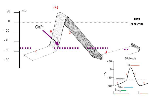 | Figure1: Scheme of the moment that the If pacemaker current acts during P cell potential (Phase 4). SAN cells characteristics. Typical profile of APs of slow fibers, which are found in the SAN, AVN and mitro-tricuspid rings. It is characterized by having lower amplitude, absence of identifiable phase 1 and 2, and phase 4 with significant slope (automatism, rhythmycity or phase 4 diastolic despolarization). In the minor left inferior figure is represented the moment of action of If, ICa-T, and ICa-Lon phase 4. |