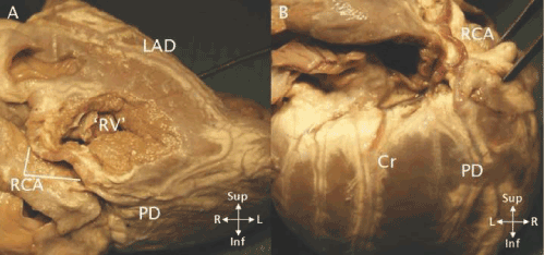 | Figure 21: A – The hypoplastic RV (‘RV’) in a heart with tricuspid atresia is demarcated by the LAD anteriorly and a posterior delimiting artery (PD) at the acute margin of the heart. B – The posterior aspect of the heart in another case of tricuspid atresia. In addition to the delimiting artery (PD) at the acute margin there is a large branch that descends from the crux (Cr) of the heart. |