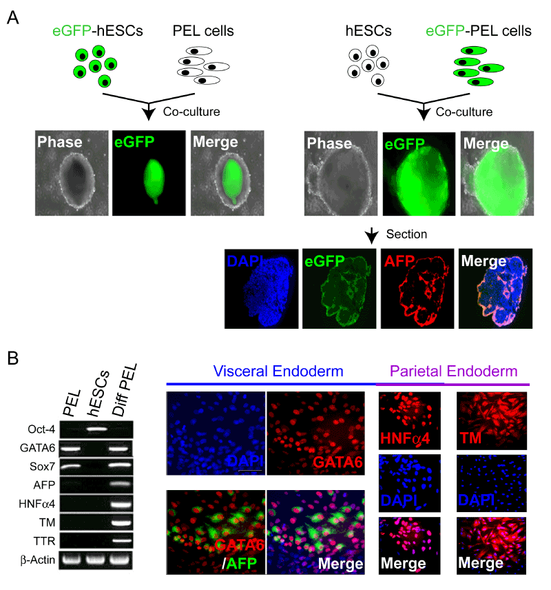 | Figure 2: Confirming the PEL identity. (A) The PEL cells constitutively emerged from their clonally-related hESCs maintained under the defined culture conditions segregate to appropriate extra-embryonic layer location when co-culturing with undifferentiated hESCs. Whether one created the chimeric aggregates by mixing green-fluorescent PEL cells (eGFP+) with white-non-fluorescent hESCs or white-non-fluorescent PEL cells with greenfluorescent hESCs (eGFP+) in suspension culture, the PEL cells established residence at the periphery of the chimeric and expressed endoderm-specific markers, e.g., AFP (red). DAPI is blue. (B) RT-PCR analysis of early PE associated markers (GATA4/6 and SOX7) and late markers associated with differentiation into visceral (alpha-feto protein [AFP], transthyretin [TTR], HNFα4) and parietal (HNFα4, thrombomodulin [TM]) endoderm in PEL cells (PEL), undifferentiated hESCs (hESCs), and differentiated PEL cells treated with BMP2 and ddcAMP (Diff PEL). Immunocytochemical analysis of hESCderived PEL cells differentiating into cells expressing visceral or parietal endoderm markers. Prior to differentiation, all the PEL cells were GATA6+ (red), but AFP-negative. Following treatment with BMP2 and ddcAMP, ~90% of cells become positive for HNFα4 (red) and TM (red) and ~10% of cells become positive for AFP (green). Note that the AFP+ cells (green) began to emerge from the GATA6+ (red) PEL cells such that the 2 markers now colocalized within the same cells. |