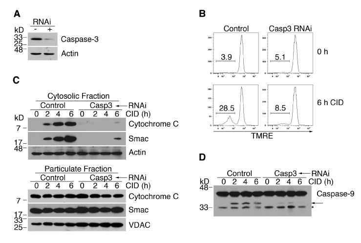 | Figure 5: Knockdown of caspase-3 inhibits mitochondrial disruption induced by activation of caspase-9. (A) Control H9-iCasp9 cells and cells expressing siRNA to silence caspase-3 were used for Western blot for casapse-3 or actin. (B) Cells as in (A) were treated with 10 nM CID and TMRE staining was performed at the indicated times to measure mitochondrial membrane potential. (C) Cells were fractionated at the indicated times. Western blotting for cytochrome c and Smac was performed. Membranes were re-probed with anti-actin or anti-VDAC for equal loading controls. (D) Cells were treated with CID and lysed for Western blotting at the times indicated. Arrow denotes processed caspase-9. Asterisk indicates degraded or non-specific protein. Results are representative of at least two experiments. |