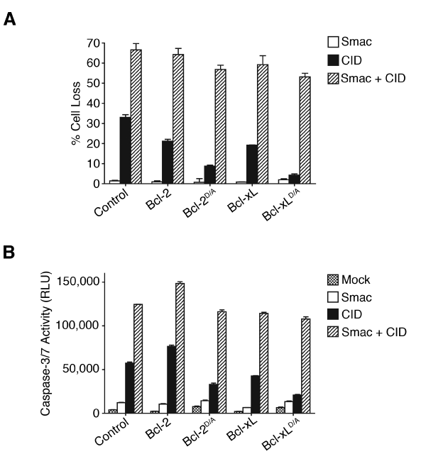 | Figure 6: A Smac mimetic overcomes the inhibitory effects of Bcl-2D/A and Bcl-xLD/A. (A) Cells were treated with 3 μM of the Smac mimetic and 10 nM of CID as indicated. Percentages of cell death (Mean ± standard deviations from triplicate wells) are displayed from a representative experiment. (B) Cells were treated as in (A) and caspase-3-like activity (Mean ± standard deviations from triplicate wells) was measured in a luminescence-based assay (Caspase-Glo 3/7, Promega). RLU: Relative Light Units. |