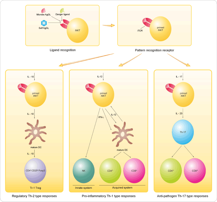 | Figure 2: iNKT cell-mediated responses in the immune system. Several different antigenic GLs: microbial GLs; danger ligands as from cellular oxidation; and self antigens (in MS case they are myelin GLs) compete for binding to iTCR. The iTCR is a PRR that are ’pattern recognition receptors’ of the innate immune system. This recognition allows immune responses to different lipids–e.g. GLs, PLs and these can allow immune responses to microbial GLs (usually with high affinity) to overlap with those to self Ags (weaker affinity as a rule). The iNKT is 1) primed by the GL/iTCR/Cd1d receptor-located interaction or interface, and then 2) respond in one of several ways according to the environment, mainly cytokines-dependent. This affects control of diverse outcomes: i) pro-inflammatory (Th-1 type responses), ii) regulatory (Th-2 type responses) or iii) anti-pathogen (Th-17 type responses). Initial and subsequent interaction with IL-12 leads to iNKT pro-inflammatory functions. IL-12-activated iNKT mediate adjuvant activity by their production of IFN-?, which in turn activates both innate and acquired immune systems. In contrast, interaction with an IL-10-driven response generates regulatory Tr1 Treg (e.g. CD4+CD25+Foxp3) that are charged with development and maintaining tolerance. In addition to their roles in autoimmunity and tolerance, iNKT cells have also anti-pathogen activity triggered by IL-17 and IL-23. Adapted and modified from Taniguchi et al. [46]. |