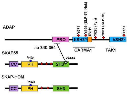 | Figure 1: Structure of ADAP, SKAP55, and SKAP-HOM. Amino acid (aa) numbering are given for human ADAP isoform 2 (NM1999335.3), SKAP55 (Y11215.1) and SKAP-HOM (AJ004886.1). ADAP has a N-terminal prolinerich domain (PRO), multiple tyrosine-based signaling motifs, two helical SH3 domains (hSH3), an Ena-VASP homology 1 (EVH1)-binding site, and binding sites for CARMA1 (caspase recruitment domain (CARD) membrane-associated guanylate kinase (MAGUK) protein 1) as well as for TAK1 (transforming growth factor-β (TGFβ)-activated protein kinase). The amino acids stretch 340-364 within the proline-rich domain of ADAP interacts with the tryptophan (W) at position 333 within the SH3 domain of SKAP55. SKAP55 and SKAP-HOM, both contain a central PH domain and C-terminal SH3 domain. In contrast to the three tyrosine-based signaling motifs SKAP55 (indicated as red squares), SKAP-HOM possesses only two of these motifs. Both SKAP-HOM and SKAP55 contain a coiled-coil region (CC) important for dimerization and an arginine (R) at position 140/131 within the PH domain that binds probably to PIP3. |