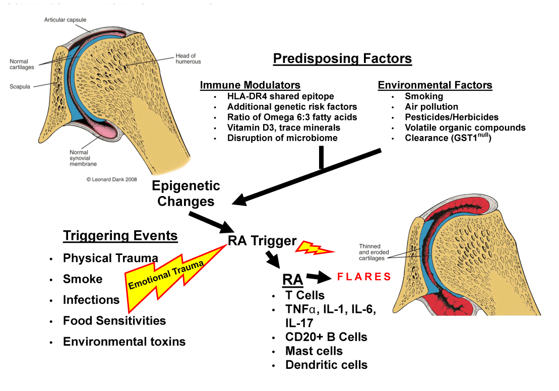 | Figure 1: Development of the rheumatoid arthritis and the onset of flares involves a multistep process. Predisposing factors were categorized into immune modulators and environmental factors. Genetic risk factors include genes in immune modulation (e.g. HLA-DR4 shared epitope, PTPN22, TNFα polymorphisms and the detoxification pathways (e.g. GST1null [52]) [1] and references therein). Diets that contain > 5:1 omega 6 to omega 3 fatty acids increase the risk for prolonged inflammation [6]. One of these potential triggering events often coupled with an emotional stress is associated with the onset of RA, although other causes which induce 34-54% of RA cases have yet to be elucidated [8]. Patients exposed to additional triggering events can experience further RA progression and flares. This figure was inspired by Figure 1 from McInnes and Schett [1]. |