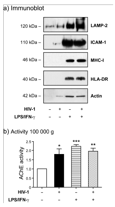 | Figure 4: Properties of exosomes released from HIV-1-infected DCs. DCs were cultured in the presence of LPS/IFN? and exosome-free suspension of NL4-3Balenv for 48h. Differential centrifugation of the cell-free supernatants yielded a pellet containing exosomes and HIV virions, which were analyzed by Western blotting for the indicated exosome markers (a). Results shown are representative of five experiments. AChE activity carried by exosomes is also shown (b). Data are expressed as the ratio of AChE activity relative to the mock condition and represent the mean ± SEM of three experiments.. |