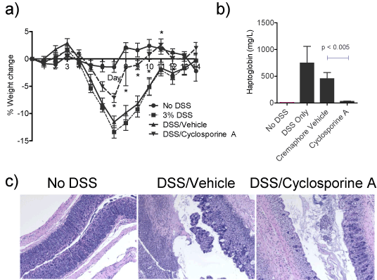 | Figure 3: Cyclosporine A significantly inhibited DSS induced weight loss and histopathology. Mice were given either drinking water or 3% DSS in the drinking water for 5 days followed by drinking water alone for the remainder of the study. Vehicle or Cyclosporine A was orally dosed BID at 15mg/kg daily and mouse body weight was measured daily. a) Daily percentage body weight change. b) Serum haptoglobin was assayed by ELISA on samples of individual mouse. Results reported as group means + SEM. c) Representative images of H&E stained colon sections. |