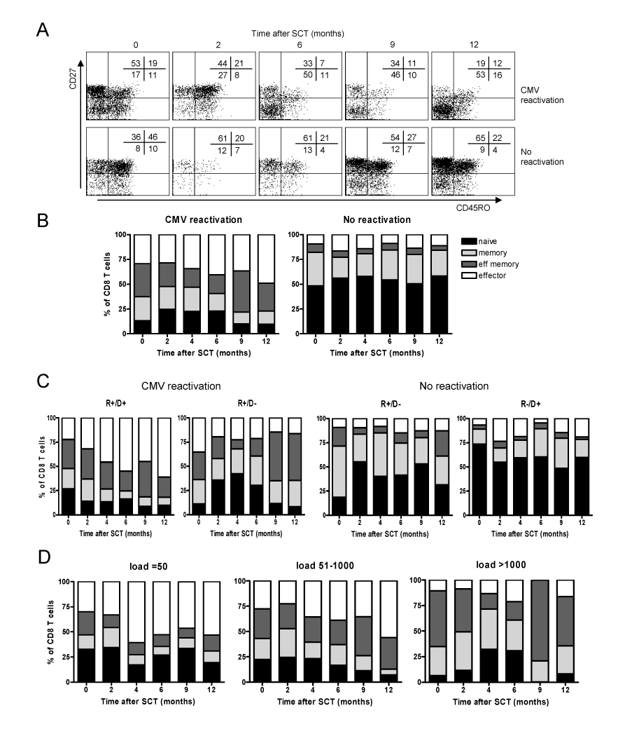 | Figure 1: Longitudinal phenotype differentiation after SCT in patients with and without CMV-reactivation. A. Representative examples of phenotype differentiation of CD8+ T cells from a patient with (upper panel) and without CMV-reactivation (lower panel). Percentages in each quadrant are shown in the upper right corner. B. Mean percentage of naïve (CD45RO-/CD27+, black), central-memory (CD45RO+/CD27+, light grey), effector-memory (CD45RO+/CD27+, dark grey) and effector (CD45RO+/ CD27+, white) CD8+ T cells in patients with and without CMV-reactivation. C. Phenotype differentiation of CD8+ T cells depending on recipient and donor CMV-serostatus in patients with and without CMV-reactivation. D. Phenotype differentiation of patients with CMV reactivation depending of the height of the peak viral load within one year post-SCT (copies/ml). |