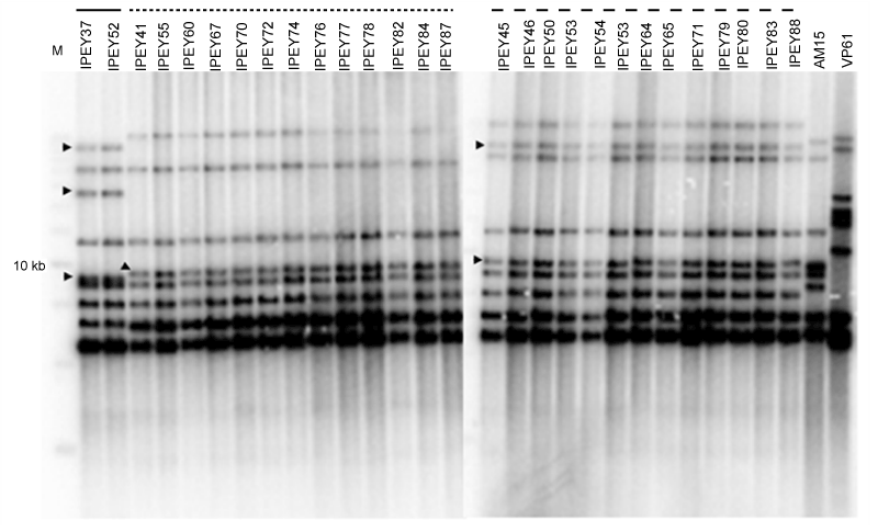 | Figure 1: Ribotype pattern of test strains along with V.harveyi (AM15) and V.parahaemolyticus (VP61) standard strains after digestion with BglI restriction enzyme. Differences in band positions are pointed by arrow (►). Three clusters were marked by solid line (Cluster I), square dot (Cluster II) and dash line (Cluster III). |